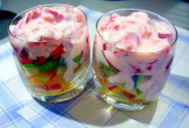 Такой салатик очень любит мой муж. Фрукты кладу любые, желательно разного вкуса. Обязательно добавляю консервированный ананас кусочками и орешки, а йогурт нам нравится без добавок. Вкусняшка