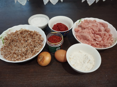 Калорийность продуктов: Фарш мясной, Гречка, Куриные яйца, Лук репчатый, Поваренная соль, Перец черный молотый, Пшеничная мука, Растительное масло, Томатный соус