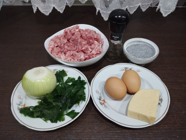 Калорийность продуктов: Фарш мясной, Куриные яйца, Твёрдый сыр, Лук репчатый, Зелень, Растительное масло, Поваренная соль, Перец черный молотый, Пшеничная мука