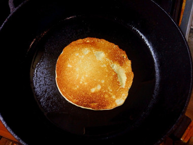 Блина на манке на дрожжах я пекла на чугунной сковороде. Блинчики формировала округлой стороной половника. Печь такие блинчики одно удовольствие – они не прилипают к поверхности сковороды, с лёгкостью переворачиваются, не рвутся.