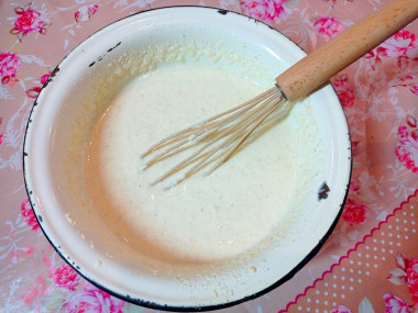 Сюда же, в чашу, влейте теплое молоко. Продолжите неинтенсивное взбивание, наша задача – соединить ингредиенты.
