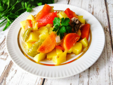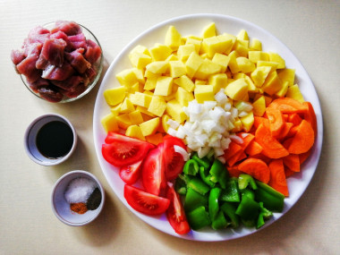 Из овощей я взяла морковь, лук, помидор, болгарский перец, добавила от себя картошку, чтобы блюдо вышло сытным. Баклажанов и стебеля сельдерея у меня не было, их я не добавляла. Говядину заменила нежирной свининой.