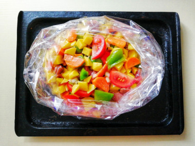 Завяжите пакет, сделайте на нём несколько проколов, чтобы во время выпекания из него выходил пар. Пакет во время нагревания будет вздуваться пузырем - это нормально. Запекайте овощи при температуре 180 градусов около 1 часа. Время и температура запекания у вас могут отличаться. Подробнее об особенностях работы духовок можно почитать в статье о духовках. Ссылка находится в конце рецепта.