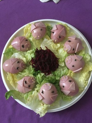 Мой вариант - много свинок из сосисок и для яркости добавила посередине "корыто" со свеклой.