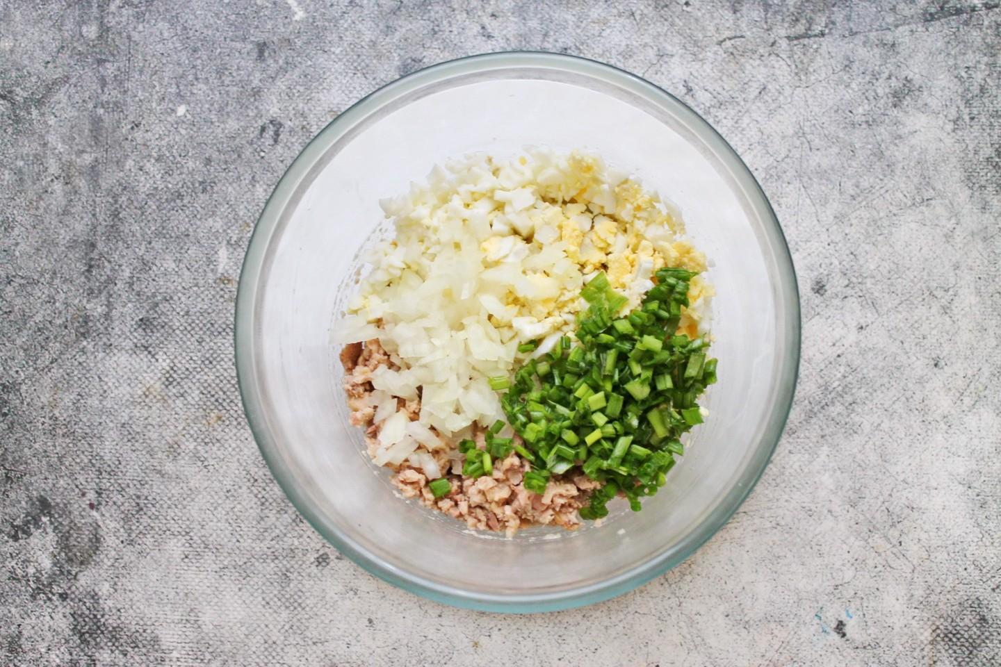 Подготовьте все необходимые ингредиенты для приготовления. Яйца вымойте и сварите вкрутую. Для этого положите чистые яйца в кастрюлю с холодной водой, доведите до кипения на среднем огне и варите в течение 12-14 минут. Слейте воду и залейте холодной водой, дайте полностью остыть. Зеленый лук и петрушку сполосните и стряхните воду. Репчатый лук почистите и сполосните.