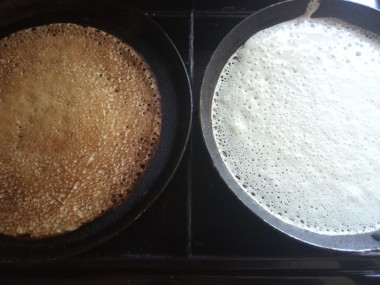 На сковороде с разогретым растительным маслом выпечь с двух сторон тонкие блинчики.