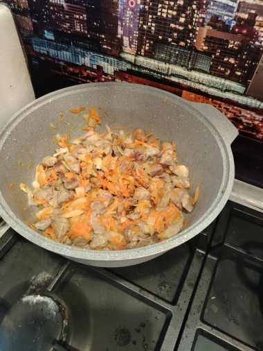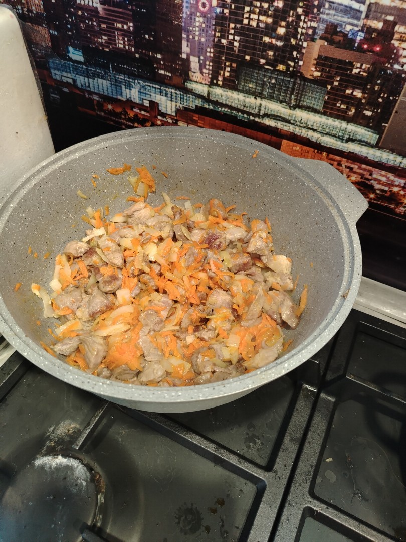 В кастрюлю к мясу отправьте лук и морковку. Пассеруйте до мягкости овощей, помешивая, чтобы они не пригорели. В конце посолите и поперчите по вкусу.