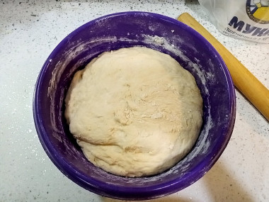 Ориентируйтесь не на количество муки, а на консистенцию теста. Готовое тесто станет мягкое и почти не будет липнуть к рукам. Оставьте его в чаше. Накройте полотенцем и поставьте на 1 час в теплое место для подхода.