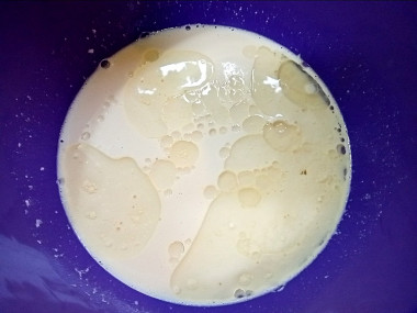 Разбейте в чашу яйца и влейте растительное масло. Смешайте яйца с молочной массой.