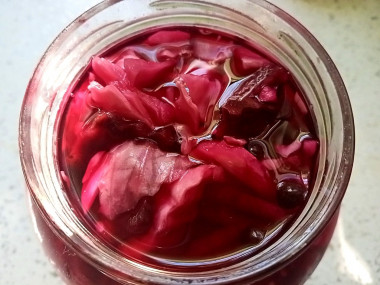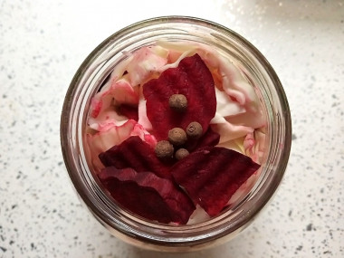 Количество овощей я не считала. Всегда ориентируюсь на тару и плотность укладки капусты. Например в этом случае у меня была двухлитровая банка. Капусту и свеклу старалась укладывать плотно. Кстати нарезала овощи фигурным ножом для красоты) Рассола развела 1,5 литра. Заливала его частями, наклоняя банку, чтобы заполнить все пустоты. Осталось у меня примерно 150-200 мл. рассола. Всегда развожу его немного с запасом. В банку для остроты и аромата добавила душистый перец. Капуста стояла у меня на столе трое суток. Бродила не сильно, даже рассол не помутнел. Потом убрала банку на два дня в холодильник. И капуста и свекла получились очень хрустящими. На вкус совсем не похоже на маринованные овощи. Сладости здесь меньше, зато есть естественная кислинка. Очень интересный и необычный для меня вкус.