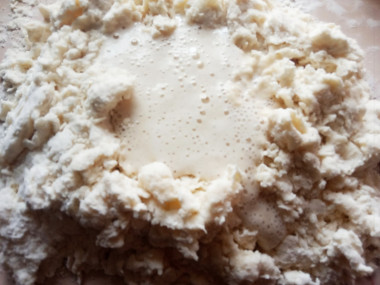 Когда масса немного начнет собираться в массу и слегка остынет, влейте дрожжевую смесь в миску с мукой.