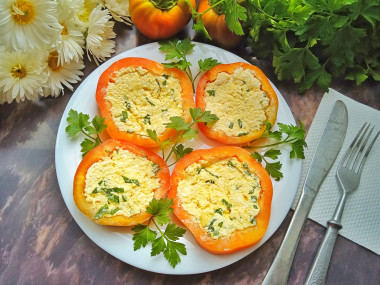 Закуска из болгарского перца очень красивая и мне захотелось повторить. Только вместо маслин и оливок добавила зелёный лук. Перец почистила от семян и плодоножки. Для начинки смешала мелко натёртые сыр и яйца, сваренные вкрутую. Добавила чеснока побольше, чтоб закуска была поострее. Ещё поперчила и чуть подсолила. Заправила майонезом. Наполнила перцы начинкой и убрала в холодильник по совету автора. Потом острым ножом аккуратно порезала на кружочки. Вид шикарный. Вкрапления зелёного лука красиво смотрится. Закуска не только очень вкусная и сытная, но и невероятно красивая. Такая закуска украсит любой стол. Готовить очень быстро и просто. Отличный рецепт на скорую руку! Большое спасибо автору за идею!