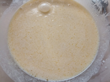 Через указанное время в приготовленную смесь вбейте куриные яйца и перемешайте до однородности. Влейте растопленное сливочное масло и ещё раз хорошо перемешайте.