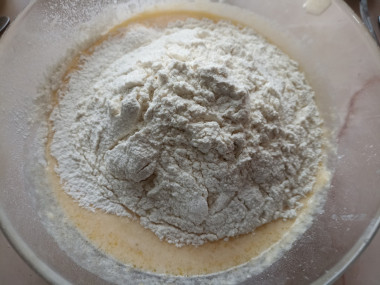 Начните частями всыпать просеянную муку, каждый раз хорошо размешивая массу ложкой. Когда тесто станет сложно размешивать ложкой, выложите его на подсыпанную мукой поверхность и продолжите замес.