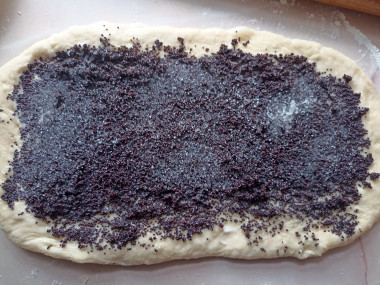 Готовое тесто раскатайте в прямоугольник и смажьте размягченным сливочным маслом. Сверху выложите мак и посыпьте сахаром.