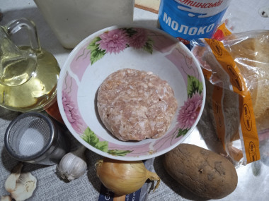 В миску с фаршем отправьте измельченный репчатый лук, пропущенный через пресс зубчик чеснока и натертый картофель. Положите туда же хлеб вместе с молоком. Добавьте соль и черный молотый перец по вкусу.