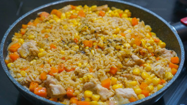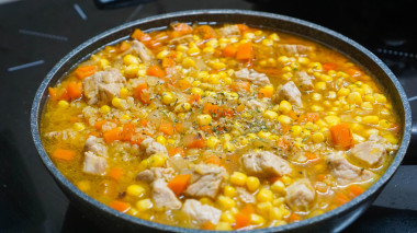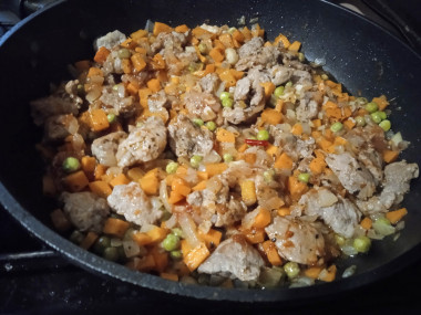 В нашей семье очень любят булгур, во всех его вариациях. Поэтому на ужин я решила приготовить булгур с мясом свинины и овощами на сковороде. Подготовила необходимые ингредиенты по списку, мясо свинины нарезала небольшими кубиками, обжарила на сковороде на сильном огне. Нарезала кубиками овощи - лук, морковь и болгарский красный перец. Порционно добавила овощи, чтобы они обжаривались с мясом, а не тушились от излишка влаги. Далее добавила промытый булгур и залила горячей водой, по рекомендации автора рецепта. Зеленого горошка у меня под рукой не оказалось, поэтому вместо горошка я использовала консервированную кукурузу, я ее очень люблю в сочетании с крупами (булгуром, гречкой или рисом). К блюду добавила специи - соль, сушеный чеснок, свежемолотый перец и итальянские травы. Блюдо оставила томиться под крышкой примерно 30 минут до готовности, за это время булгур как раз впитает в себя всю влагу и станет мягким.