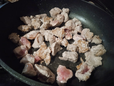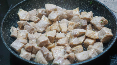Мясо свинины нарежьте на кусочки и обжарьте на сильном огне с добавлением небольшого количества растительного масла. Кусочки мяса должны немного поджариться.