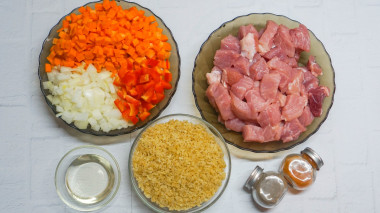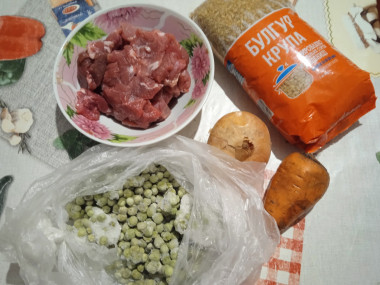 Как сделать булгур со свининой и овощами на сковороде? Подготовьте для этого необходимые ингредиенты. Все овощи хорошо промойте в проточной воде от загрязнений. Зеленый горошек можно использовать как свежий, так и замороженный. Предварительно размораживать его необязательно.
