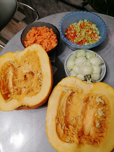 - тыкву очищаем от кожуры, извлекаем сердцевину с семенами и волокнами, а мякоть тыквы режем кубиками;