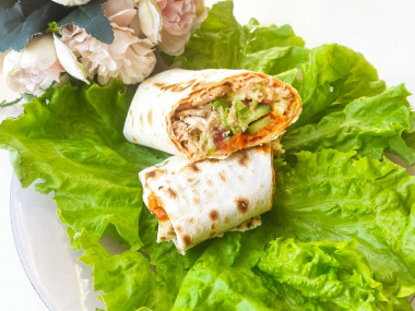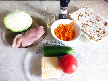 Калорийность продуктов: Капуста, Помидоры, Огурцы, Твёрдый сыр, Перец черный молотый, Растительное масло, Лаваш тонкий, Соль, Специи сухие, Куриное филе, Корейская морковь, Йогурт, Чеснок, Лимонный сок