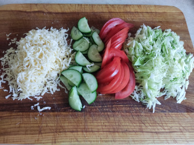 Капусту я брала молодую белокочанную, которую мелко нашинковала. Куриное филе обжарила на сковороде и порезала соломкой. Огурцы нарезала на полуколечки, помидоры нарезала дольками,сыр натерла на мелкой тёрке. Соус для шаурмы готовила на основе майонеза и кетчупа.