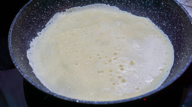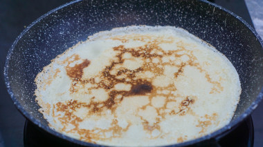 Возьмите сковороду - блинную или ту, в которой вам удобно выпекать блины. Сковороду разогрейте до горячего состояния. Смажьте растительным маслом. Налейте на неё немного теста и, поворачивая и наклоняя ее, распределите его по всему дну.