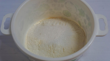 К муке добавьте сахар, соль, щепотку соды и перемешайте.