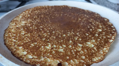 Я добавила слишком много соды и молоко у меня было хорошо прокисшим, поэтому получилось очень много воздушных пузырей. Чтобы получить более гладкие блины мне пришлось взбить тесто блендером. Тесто стало более гладким и блины удались, хоть и не без "первого блина комом".