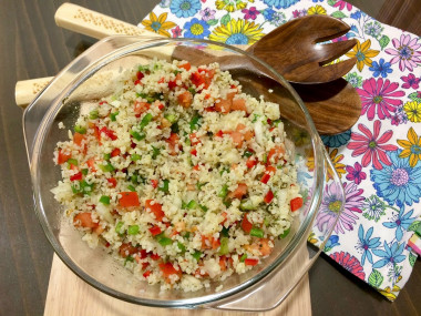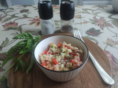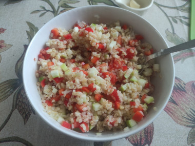 Салат с булгуром и овощами - салат, очень популярный в восточных странах. Несмотря на то, что считается салатом, он весьма сытный и вполне может выступать как самостоятельное блюдо. Отличное сочетание крупы и овощей, гармонично дополняющих друг друга. Большое спасибо за рецептик!!!
