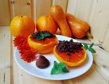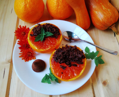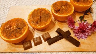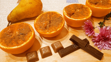 У меня сегодня день необычных десертов! Еще одним интересным и ярким перекусом стал запеченный апельсин. Я взяла один на пробу. Он сам по себе очень интересный, с красноватой мякотью. Сделала все по рецепту. Апельсин разрезала, сделала надрезы вдоль шкурки и в середине. Посыпала смесью сахара и корицы, сахар обычный белый. Запекала, правда, десять минут под грилем в стеклянной форме. Сока выделялось много! Верх апельсинов запекся и превратился в карамельную тягучую корочку. При этом фрукт стал таким сочным, просто не знала куда деть столько сока) Консистенция цитруса получилась не вареной, как я ожидала, но и сырым он не был. Что-то среднее. Мне понравилось) Мякоть горячая, влажная, пропитанная сахарным сиропом. Это необычно для меня, ничего подобного раньше не пробовала. Корицу в принципе не люблю, но здесь она стала прекрасным ароматизатором. Кушать этот десерт оказалось проще всего вынимая мякоть чайной ложечкой из перепонок. Сверху апельсины украсила натертой трюфельной конфетой, но делать это надо после остывания, чтобы украшение не расплавилось. Рекомендую попробовать этот десерт всем, кому хочется необычных ощущений) Автору спасибо за рецепт!