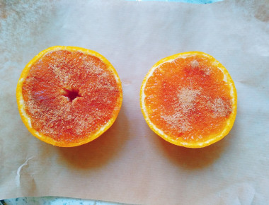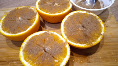 Смешайте коричневый сахар и молотую корицу, посыпьте достаточно обильно поверхность разрезанных апельсинов. Подготовленные плоды поставьте в разогретую до 200 градусов духовку. Запекайте апельсины около 5 минут. Точное время и температура зависят от вашей духовки. Узнать об особенностях работы духовок можно, прочитав отдельную статью, ссылка в конце рецепта.