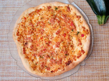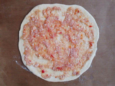 Замесила тесто на сыворотке. Фарш взяла готовый свиноговяжий. Смешала с томатом домашним и измельченными в блендере луком и чесноком. Добавила немного черного молотого перца и соль. Острую начинку не хотела делать.