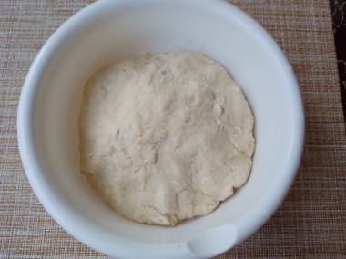 Размешайте ингредиенты и замесите тесто. По необходимости немного добавьте муки. Ориентируйтесь на консистенцию теста. Оно должно быть эластичным, не липким, как на пельмени. Накройте миску пищевой пленкой и уберите на 30 минут в холодильник. Заранее включите духовку на 220 градусов.