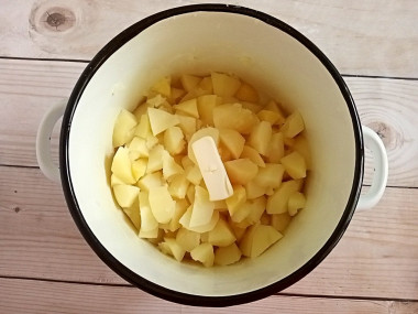Сразу в горячий картофель добавьте сливочное масло. Разомните картофель толкушкой. Влейте теплое молоко и еще помните, чтобы картофель впитал в себя все молоко. Если хочется сделать более жидкое пюре, то долейте горячий отвар, который наливали отдельно в кружку.