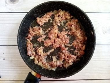 Выложите в сковороду к луку тушенку. Прогрейте все вместе.
