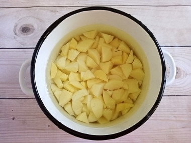 Очищенный картофель сложите в кастрюлю и залейте водой, чтобы он был полностью залит. Как выбрать кастрюлю читайте в статье в конце рецепта. Поставьте кастрюлю на огонь и доведите до кипения. Немного подсолите. Варите картофель 20-25 минут до мягкости. Затем горячую вод слейте. Немного можно налить в кружку, чтобы использовать для пюре.