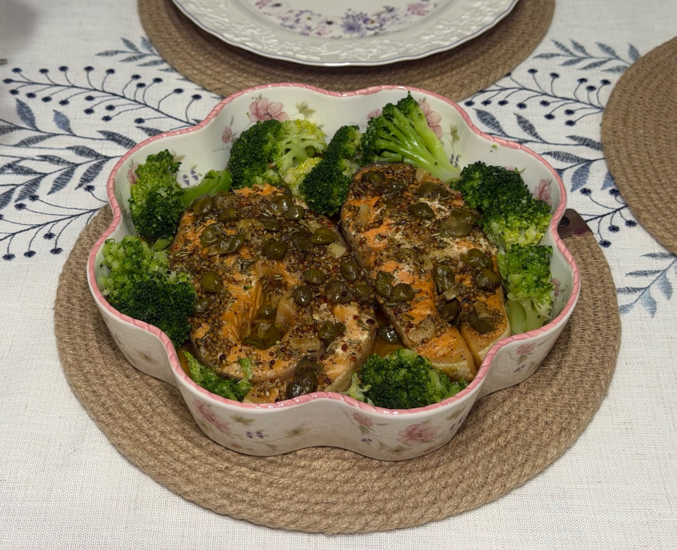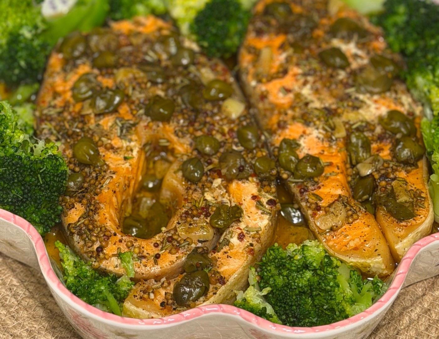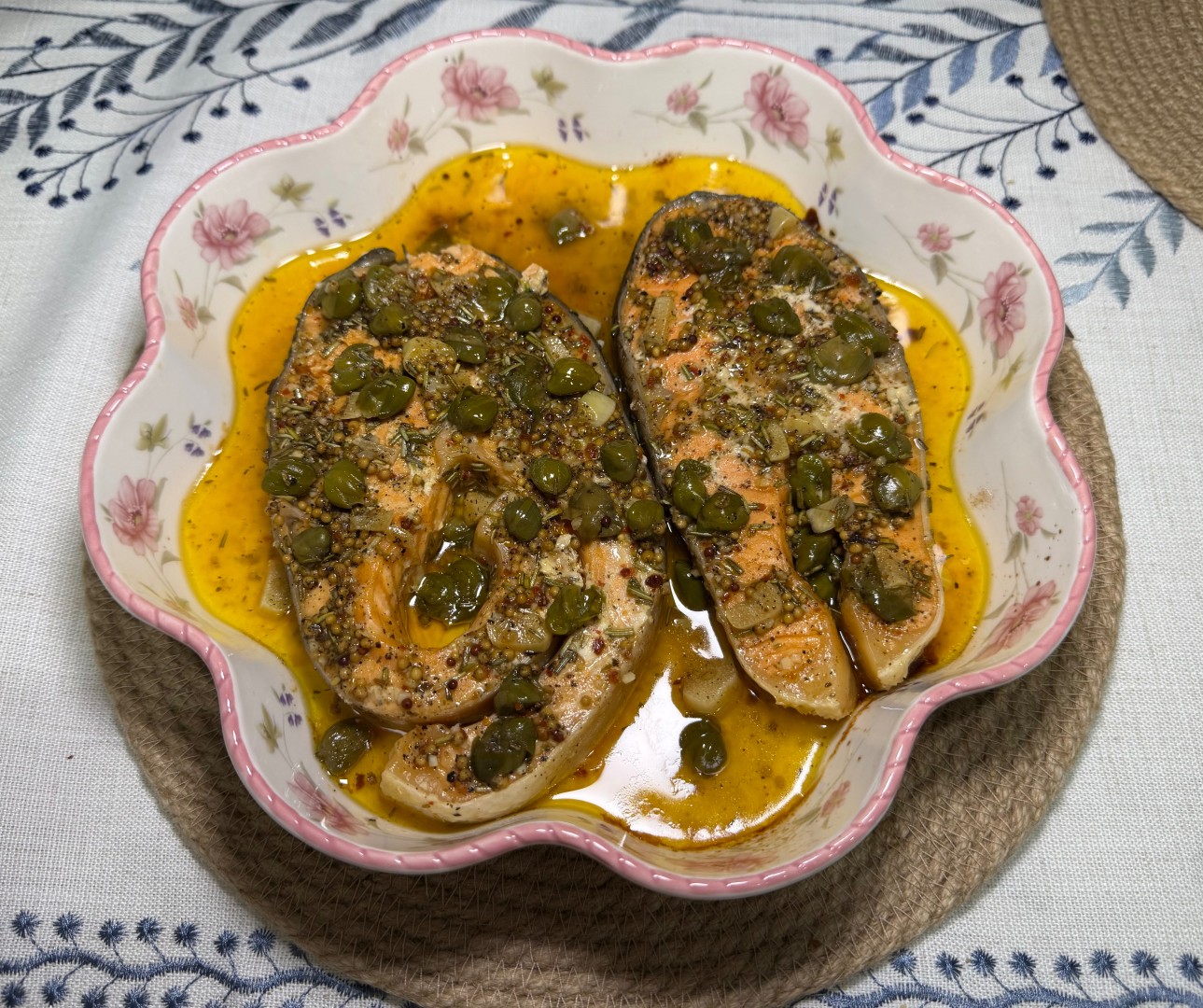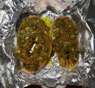 Очень изысканное блюдо! Заменила форель на чуть менее жирный кижуч, а вместо базилика и укропа, которых у меня не было, я взяла сушеный розмарин, так как он на мой взгляд тоже хорошо сочетается с рыбой. И добавила чуть меньше масла, чем было указано. Каперсы с лимоном сюда очень кстати. В результате получился очень необычный, в хорошем смысле этого слова, вкус, сочная рыбка в море сока и новый рецепт в копилку. Подавала с вареной брокколи, чтобы сбалансировать вкус жирной рыбки. Хотелось бы отметить, что до этого не пробовала сочетание рыбы и зернистой горчицы, а оно оказалось настолько удачным, что теперь буду его использовать и в других рыбных блюдах. Спасибо 🥰🌸