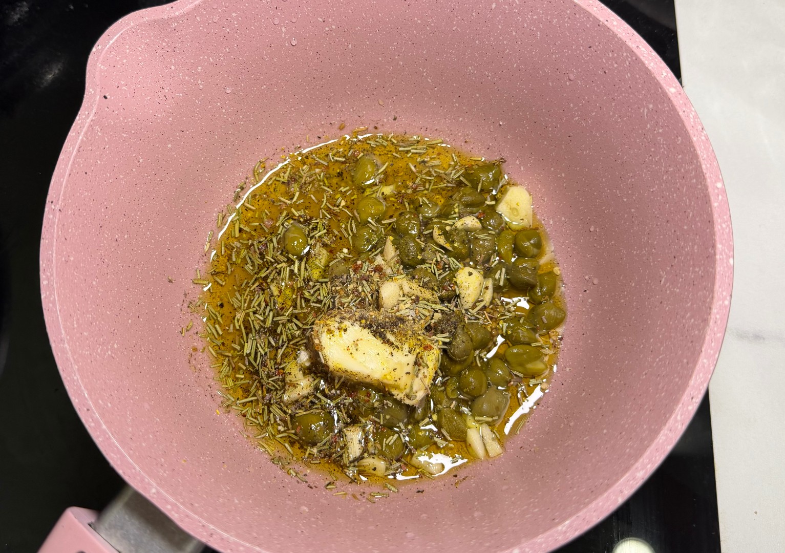В сотейник выложить сливочное и оливковое масла, рубленый чеснок, каперсы, лимонный сок, горчица и сушеные травы.Шаг 4: