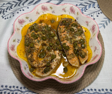 Рыбу слегка посолить и полить соусом из каперсов.Шаг 7: