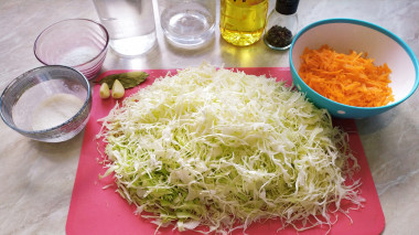 Капусты у меня было чуть больше килограмма, нарезала ее от руки соломкой. Лучшее воспользоваться комбайном, тогда капуста получится как паутинка. Морковь я натерла на крупной тёрке, а чеснок на средней. Овощи слегка помяла, чтобы они стали чуть мягче и пустили сок. Для этого удобно взять миску большого объема. Мять капусту лучше надев одноразовые перчатки.