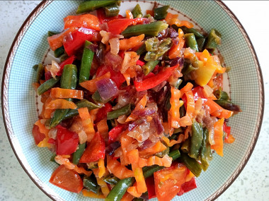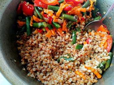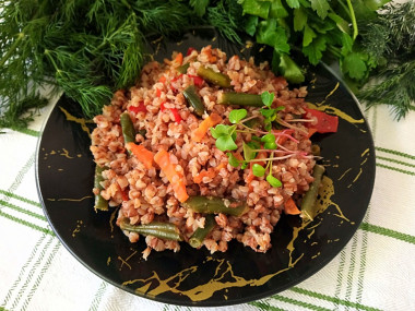 Решила на ужин приготовить гречку на сковороде с овощами. Гречка не только вкусная, но и очень полезная, поэтому стараюсь чаще готовить ее с различными добавками. С таким набором овощей я ещё не пробовала готовить. Зажарка у меня получилась ну очень яркая и аппетитная, хотелось ее прямо так съесть) Помидоры не добавляла, мне не хотелось, чтобы была кислинка в этом блюде. Тушила овощи до мягкости моркови и стручковой фасоли. В блюдо добавила ещё паприку и черный перец для небольшой остринки и аромата. Гречка с овощами очень сочная и вкусная. Для нас необычное сочетание, но всем понравилось. Спасибо за рецепт.
