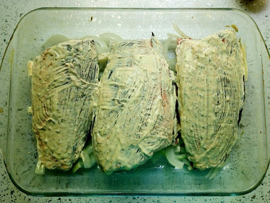 Лук очистите от шелухи, ополосните и нарежьте полукольцами. Для запекания берите любу. жаропрочную форму - стеклянную, металлическую или, как у меня, керамическую. Дно и бока формы смажьте растительным маслом и по всему дну распределите нарезанный лук.