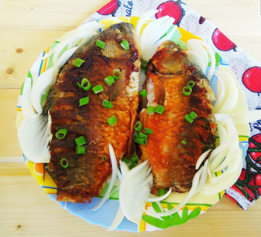 У меня было пять карасиков разного(но не большого!)размера.рыбка ещё плескалась когда я её чистила.Разрезала просто на две части.остальное по рецепту автора.Карасики получились очень вкусные.сочные .*сладенькие*с лучком просто бомба!!!Автору спасибо за рецепт!!!