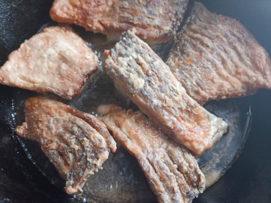 Крупного карася необходимо разрубить острым ножом на куски, распластав вдоль спинного хребта - так кусочки лучше прожарятся и подрумянятся. Мелких рыб оставляйте целиком, главное, чтобы они помещались на сковороде при жарке (но я советую все-таки нарезать на кусочки).