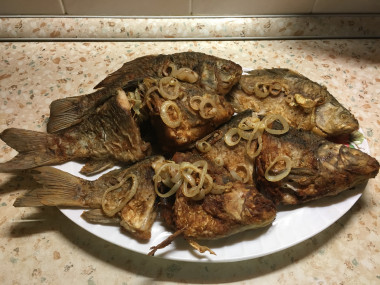 Приготовила жареного карася на сковороде в муке. Подготовленные тушки карася распластала по хребту. Чтобы не чувствовались косточки, на спинках сделала насечки острым ножом. Рыбу присолила, поперчила, сбрызнула соком лимона, оставила минут на 20. Затем обваляла каждый кусочек в муке и обжарила на растительном масле. Вот только про лук забыла ... было бы неплохо подать его к рыбе. Но и без лука- жареный карась - это очень вкусно!!! Спасибо автору!