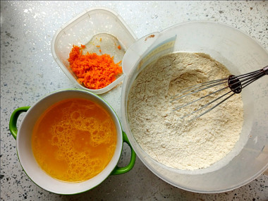 Аккуратно соедините мучную и апельсиново-маслянную смеси и быстро перемешайте до получения однородного теста.