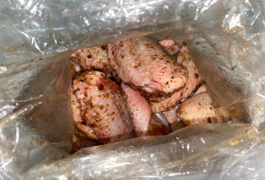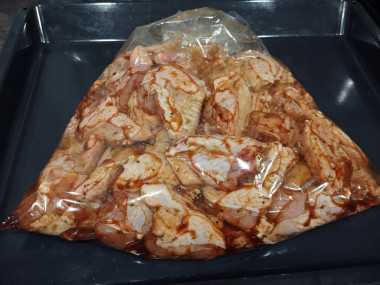 Как сделать куриные крылышки в рукаве? Приготовьте ингредиенты. Крылья лучше покупать в охлажденном виде, так как замороженный продукт уступает охлажденному по вкусовым качествам. На поверхности не должной быть кровоподтеков и повреждений. Цвет светло-розовый. Надавите пальцем на мякоть, если вмятина быстро не выпрямится, значит продукт несвежий. Липкая и скользкая поверхность, а также неприятный, кислый запах - также признак испорченности.
