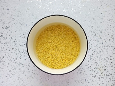 Первым делом необходимо подготовить пшено. В отдельной посуде залейте пшено горячей водой и оставьте постоять 1-2 минуты. Это необходимо для того, чтобы в готовой каше пшено не горчило. Горячей водой с пшена смоется тонкая плёночка, которая покрывает каждое зернышко.