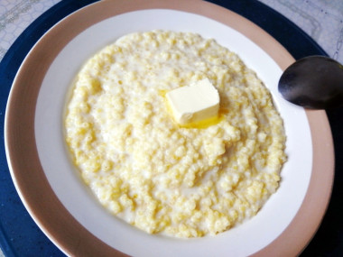 Взяла в соответствии с рецептом 125 г пшена, залила его на несколько минут горячей водой, чтобы убрать из крупы горечь. Затем промыла несколько раз в холодной воде. Выложила в 0,5 л кипящего молока, добавила соль, 3 ч. ложки сахара, перемешала. Сахара положила меньше, чем в рецепте, но каша получилась довольно-таки сладкой. Варила ее 20 минут под крышкой на маленьком огне, периодически помешивая. Затем настаивала под крышкой 15 минут. За это время пшено впитало в себя молоко и распарилось. Подавала кашу со сливочным маслом.
